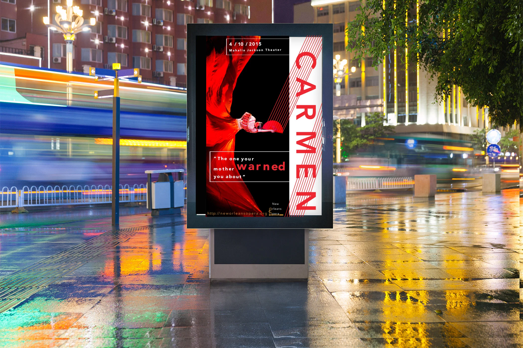 I redesigned a logo for New Orleans Opera using opera glasses. This classic symbol denotes the participation of the observer in the opera experience. The design used the two O’s in Orleans and Opera for a unique composition. In the additional marketing pieces, visual images from the opera Carmen, Figaro, and Lucia were used to create excitement and visual engagement.